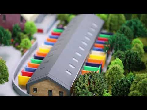 The layout features multiple buildings with distinct purposes. In the foreground, a long, modular structure houses individual animal units, each separated by brightly colored partitions, suggesting organized and hygienic spaces for different animals. These units are designed for easy access, ventilation, and maintenance.