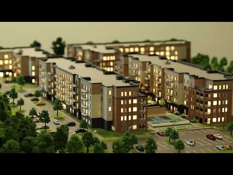This architectural scale model represents a modern residential complex designed for urban living. The development features multiple mid-rise apartment buildings arranged around landscaped areas, pedestrian pathways, and open green spaces.