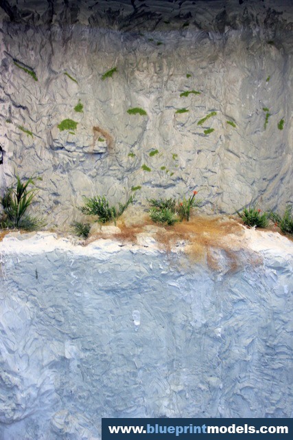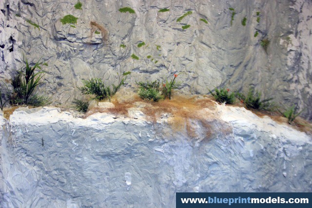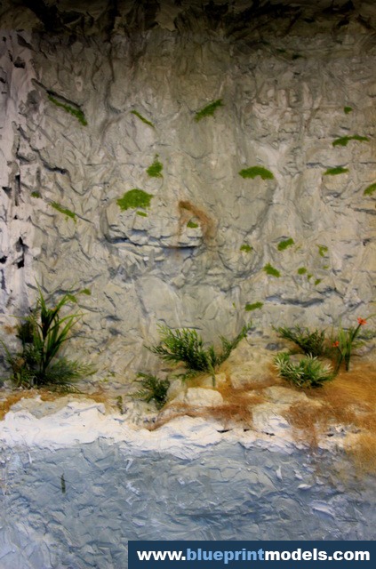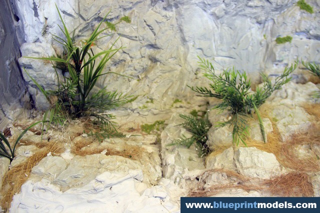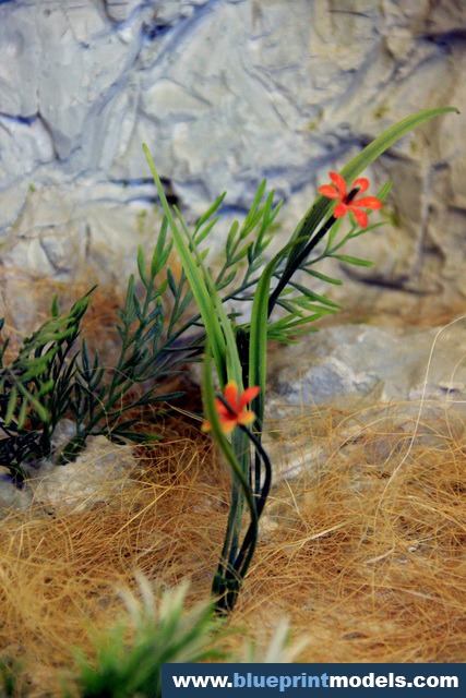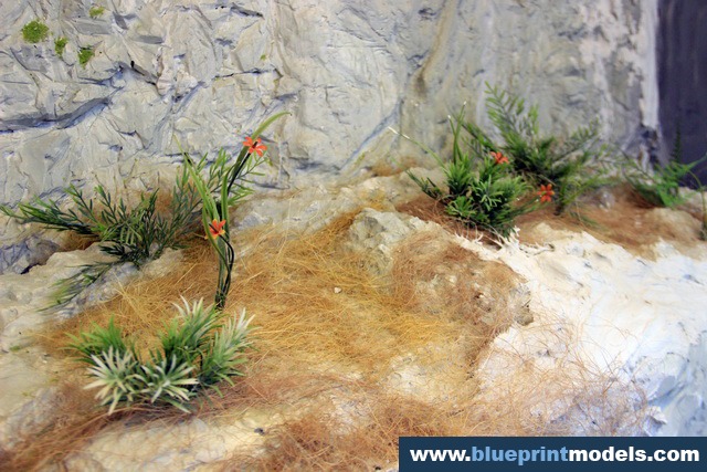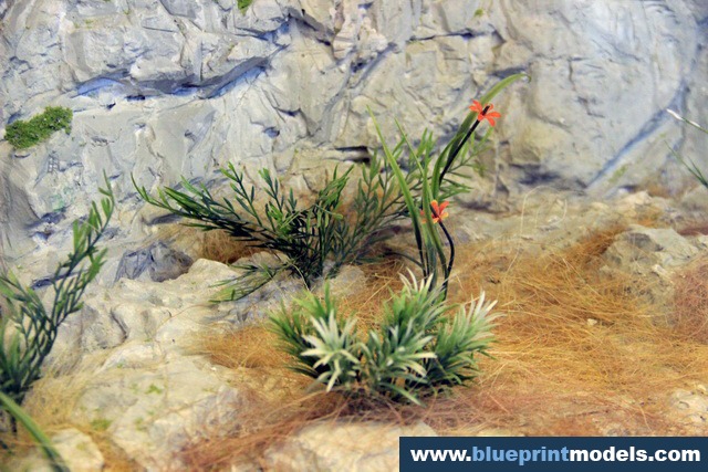 The vegetation and rock types were chosen according to the on-site reality, and a LED-based lighting system was installed in the upper section of the presentation frame in order to highlight the relevant elements.The rocks were made with plaster moulds, and the vegetation is synthetic.