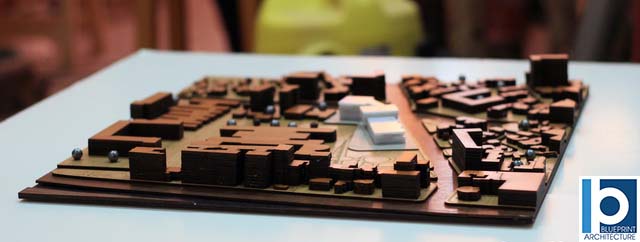This is a urban architectural model, a type of architectural model. It represents a proposed building or a set of buildings within an existing urban context. The model features different levels of detail and color to distinguish between existing structures and the new proposed buildings.